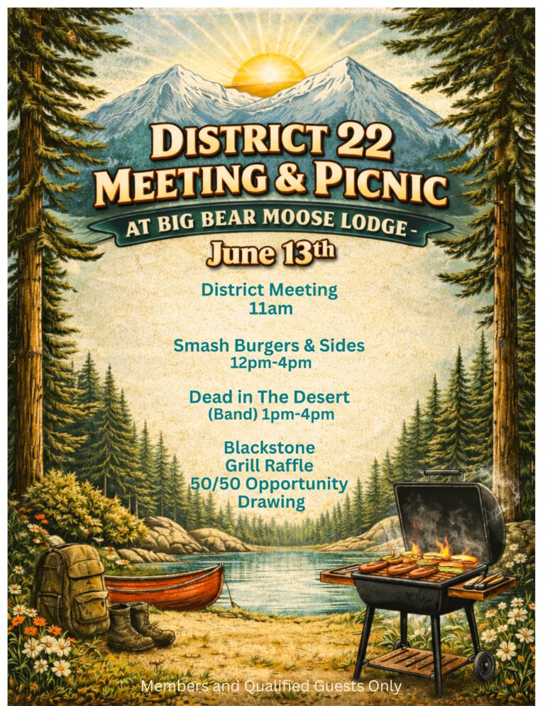 Disclaimer: The Loyal Order of Moose is a private organization. Activities and events referred to on this Website and in the Moose Newsletter are available to Members in good standing and their qualified guests. This Website is for informational purposes only with proprietary information intended for Members only. General information is provided for the public at large but should not be construed as solicitation for membership. This Website is an initiative of the Big Bear Moose Lodge 2085, Fawnskin, California, and is not sanctioned by the Loyal Order of the Moose, Moose International, or any subsidiary thereof. All logos, trademarks, and service marks pertaining to the Loyal Order of Moose and / or its programs or degrees are Copyright Moose International, Inc., Mooseheart, Illinois, USA.